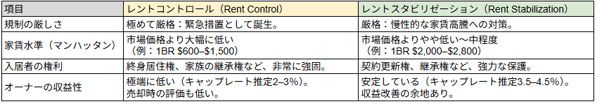 ニューヨークの家賃規制システム「レントコントロール」と「レントスタビリゼーション」は、どちらも住宅問題を背景に生まれましたが、その規制の度合いと市場への影響は大きく異なります。