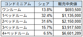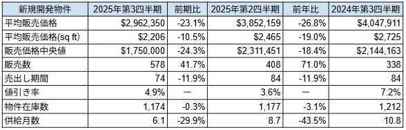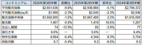 ・中央値販売価格は前年同期比 -18.4%となり、1,750,000ドル(前年比 -18.4%)。平均販売面積は前年比 -9.6%(1,343平方フィート)。