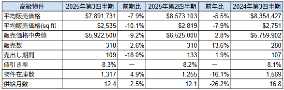 成約件数は3,158件と前年同期比で13.4%増加し、過去10年平均(3,029件)を上回る水準に。販売価格の中央値も1,180,000ドル(前年同期比+5.8%)となり、ここ3四半期で3度目の上昇を記録しました。